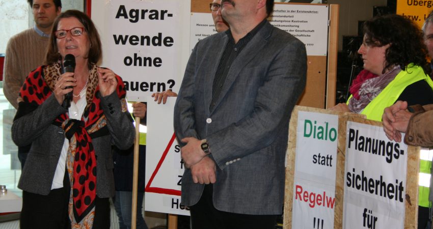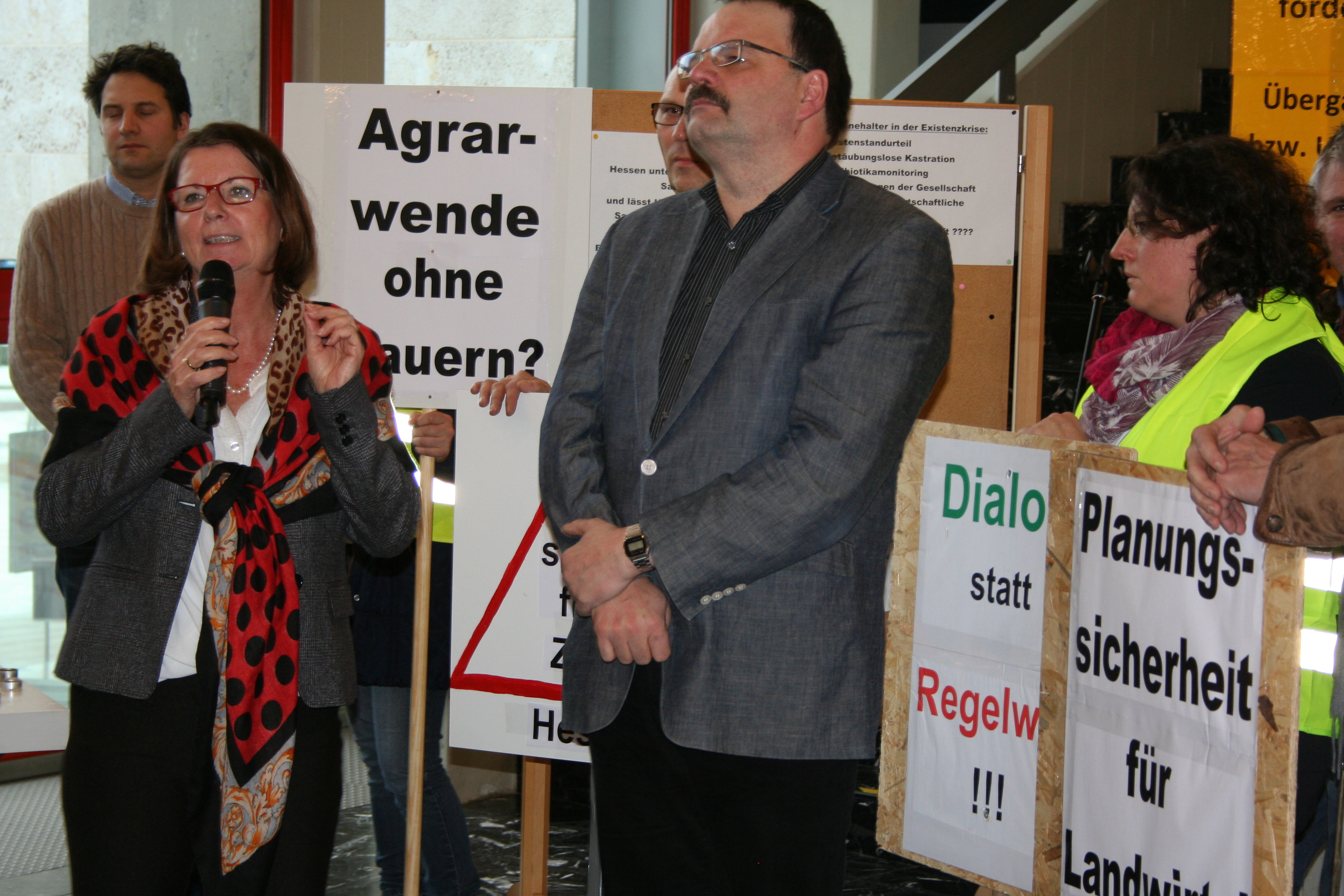 Begleitet wurde nämlich die Veranstaltung von massiven Protesten der Landwirte, die mit der Haltung von Säuen ihren Lebensunterhalt erwirtschaften. Ausgelöst durch ein Urteil des Bundesverwaltungsgerichts (BVG) zur Vergrößerung der Kastenstände für trächtige Sauen sind nun alle Länder aufgefordert, die Umsetzung dieses Urteils zu verfolgen. Die Ministerin sicherte den Betroffenen zu – in Hessen gibt es noch 400 Betriebe mit Sauenhaltung-, dass der Zeitplan für die Umsetzung in Abstimmung mit den anderen Bundesländern sowie im Austausch mit den betroffenen hessischen Betrieben und unter Beteiligung von Verbandsvertretern erfolgen soll. Gerade dem Vorsitzenden des hessischen Bauernverbands, Karsten Schmal, war daran gelegen, dass zukünftig noch ausreichend Ferkel von hessischen Höfen mit Sauenhaltung geliefert werden können und nicht, wie oft befürchtet, nur noch aus Ländern wie Polen oder den Niederlanden, weil dort geringere Tierschutzauflagen gelten.