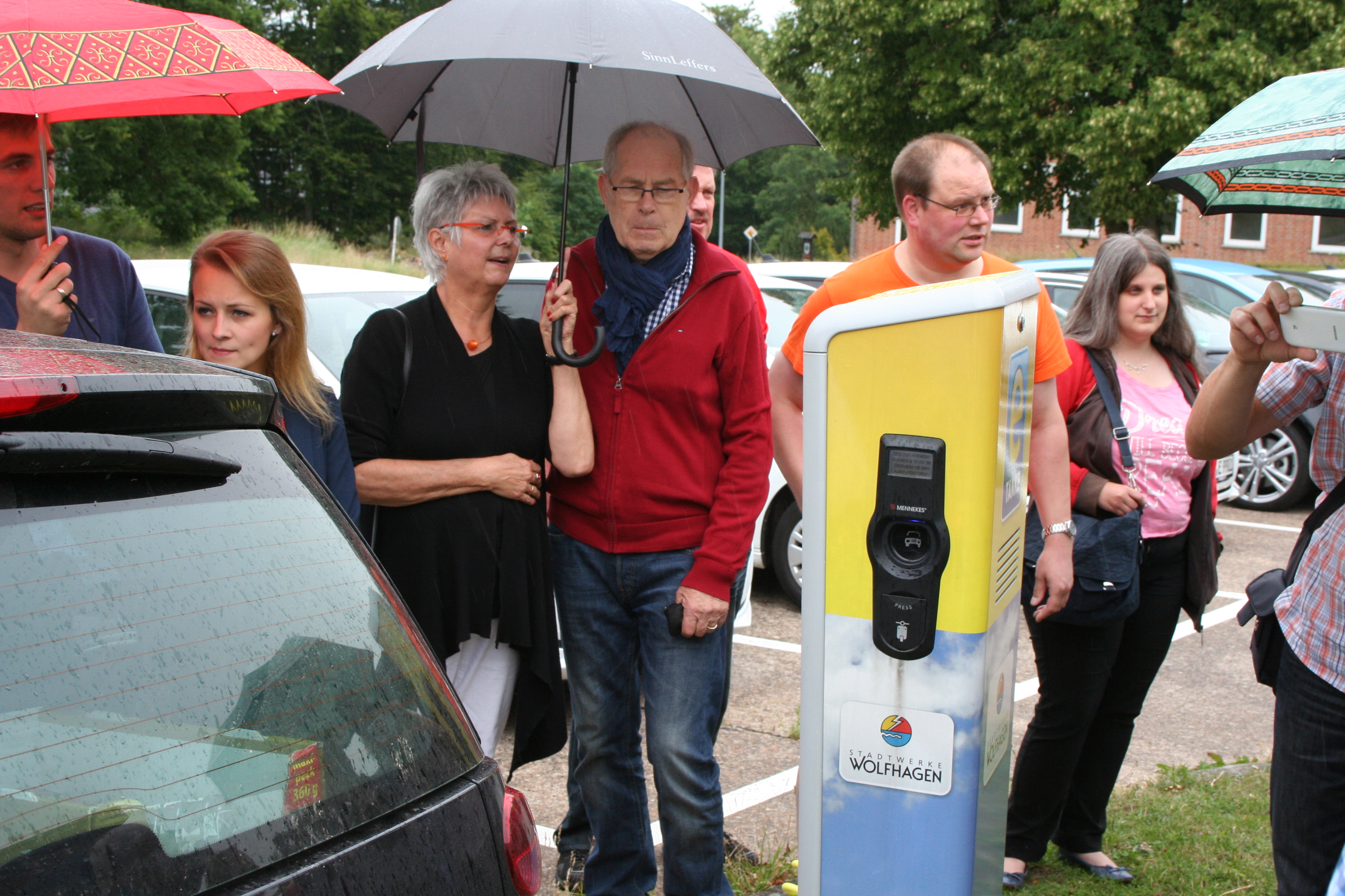 Im Rahmen der Rallye für E-Fahrzeuge ins Wolfhager Land besuchten die GRÜNEN Stadtverordneten Ursula Dittmar-Loewe, Lothar Rost und der Fraktionsvorsitzende Edmund Borschel gemeinsam mit 40 interessierten “TestfahrerInnen“ auch die alte Anlage der Pommernkaserne in Wolfhagen, mit einer im Dach integrierten 193 kWp PV-Anlage, welche auf einer Fläche von 4.300 m² etwa 160.000 kWh „sauberen“ Strom erzeugt. Dabei werden 7.160 amorphe Glas-Solarmodule verwendet, die eine hohe Lichtdurchlässigkeit gewähren. Damit kann der jährliche Stromverbrauch von etwa 100 Single-Haushalten abgedeckt werden.