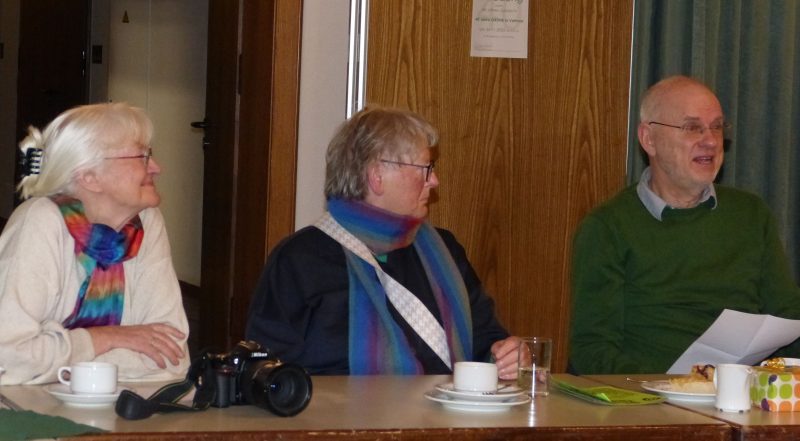 Bei Kaffee und Kuchen wurde geplaudert, gelacht, Geschichten erzählt und Geschichte erinnert. Nach der Begrüßung durch den Verbands- und Fraktionsvorsitzenden Siegfried „Sigi“ Kopperschmidt erinnerten die Gründungsmitglieder Edmund „Ede“ Borschel (stellv. Kreistagsvorsitzender), Marianne Sauer (Mitglied des Magistrats der Stadt Vellmar) und Doris Schmieder-Gellert an die ersten Jahre GRÜNER „Umtriebe“ in der Ahnestadt. Es war die Zeit des konstruktiven Misstrauensvotums gegen Bundeskanzler Helmut Schmidt (SPD), des sog. „Berliner Appells – Frieden schaffen ohne Waffen“ und der berühmten Rede des US Präsidenten Ronald Reagan an der Berliner Mauer – „Mr Gorbatschow, tear down this wall“. Der gedankliche Streifzug führte die Gäste von den ersten Aktionen engagierter Umweltschützer/innen und die Gründung des Stadtverbandes im Jahr 1982 über die erste gewählte Fraktion in der Stadtverordnetenversammlung (Stavo) von Vellmar bis über die Anfangsjahre GRÜNER Politik hinaus zum Anschluss der Stadt an die Straßenbahnlinie 1, den gemeinsam mit CDU und FDP initiierten Bürgerentscheid gegen überteuerte Pläne der SPD bei der Rathaussanierung bis hin zu den jüngsten Auseinandersetzungen um die Ausweisung des Baugebietes Vellmar-Nord.